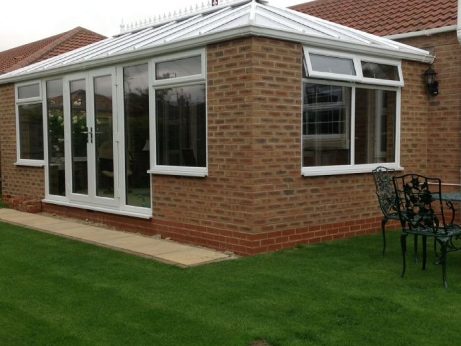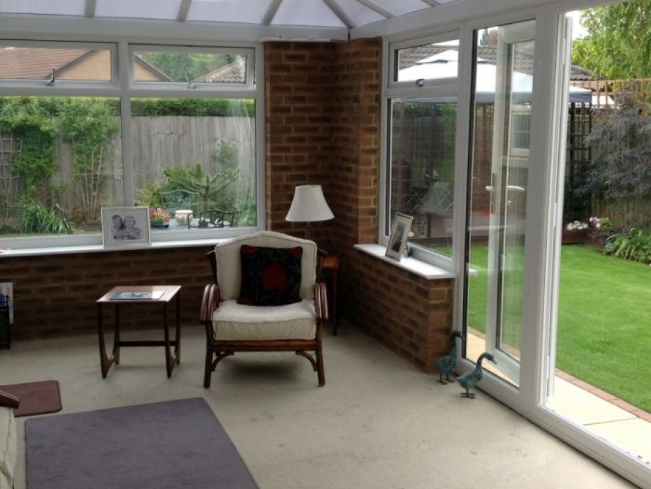 Mr & Mrs Norman are delighted with their new conservatory installed towards the end of 2013. They were originally going to have a pvc-u lean too style but decided to have a glass living room design for all year use and to add 5 - 7% value to their property. They decided to leave the walls brick rather than plaster them. This photo is taken shortly after installation. Mr & Mrs Norman are choosing a timber effect laminate flooring to compliment the bricks.